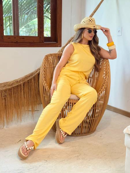 CONJUNTO FEMININO EM MALHA LEVE, COMPOSTO POR REGATA E CALÇA DE CINTURA MÉDIA COM ELASTICO E AMARRAÇÃO AJUSTAVEL.
