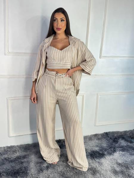 O CONJUNTO EM LISTRAS É O QUERIDINHO POR NOSSAS CLIENTES, UM CONJUNTO SUPER ELEGANTE E ESTILOSO ELE É COMPOSTO POR TRÊS PEÇAS( CALÇA QUE ACOMPANHA O CINTO, CAMISA E O CROPPED) A CALÇA TAMBÉM É COM FORRO PARA MAIOR CONFORTO DA CLIENTE.